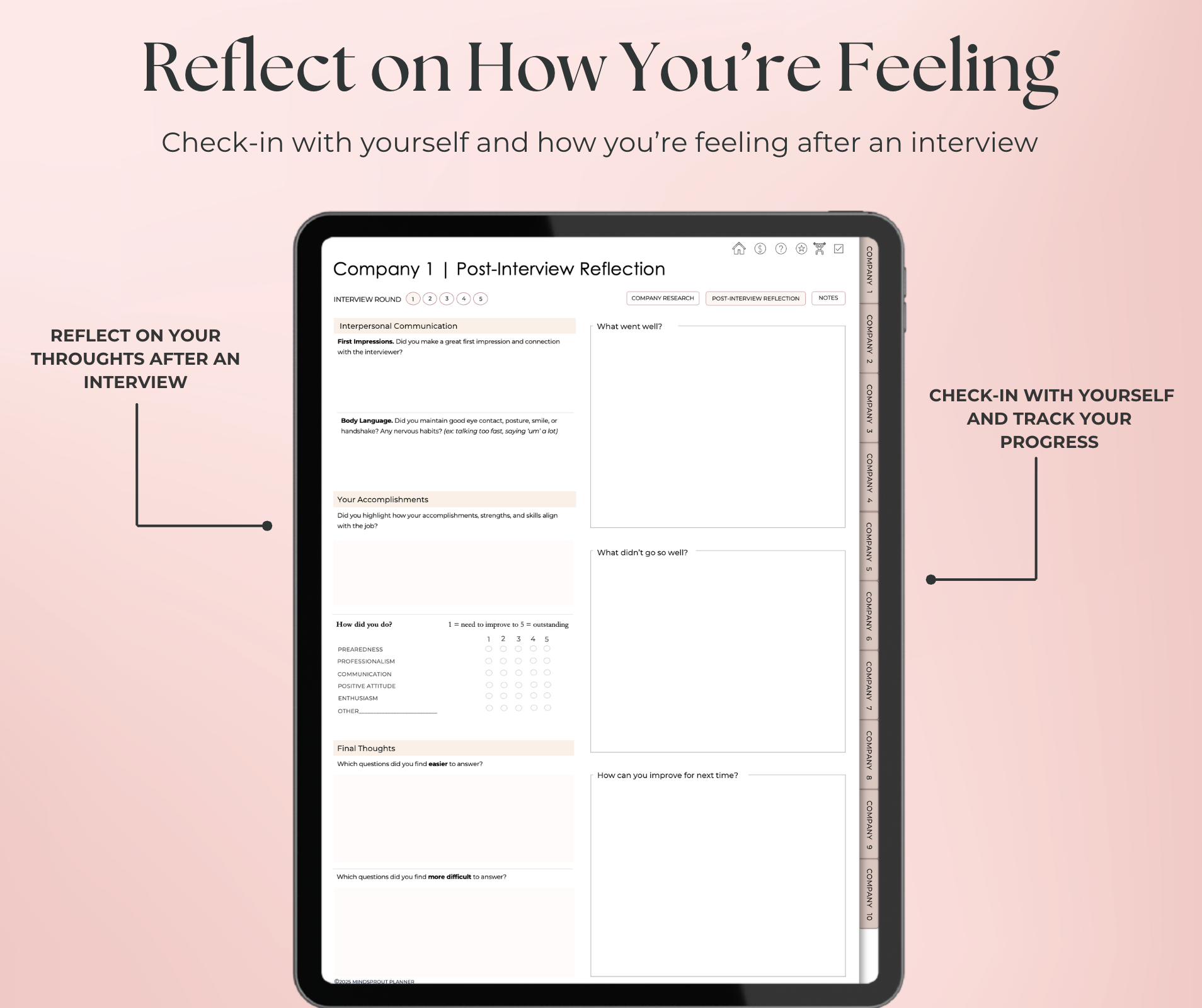 - Post-Interview Reflection page: Check in with how you're feeling and track your progress after each interview